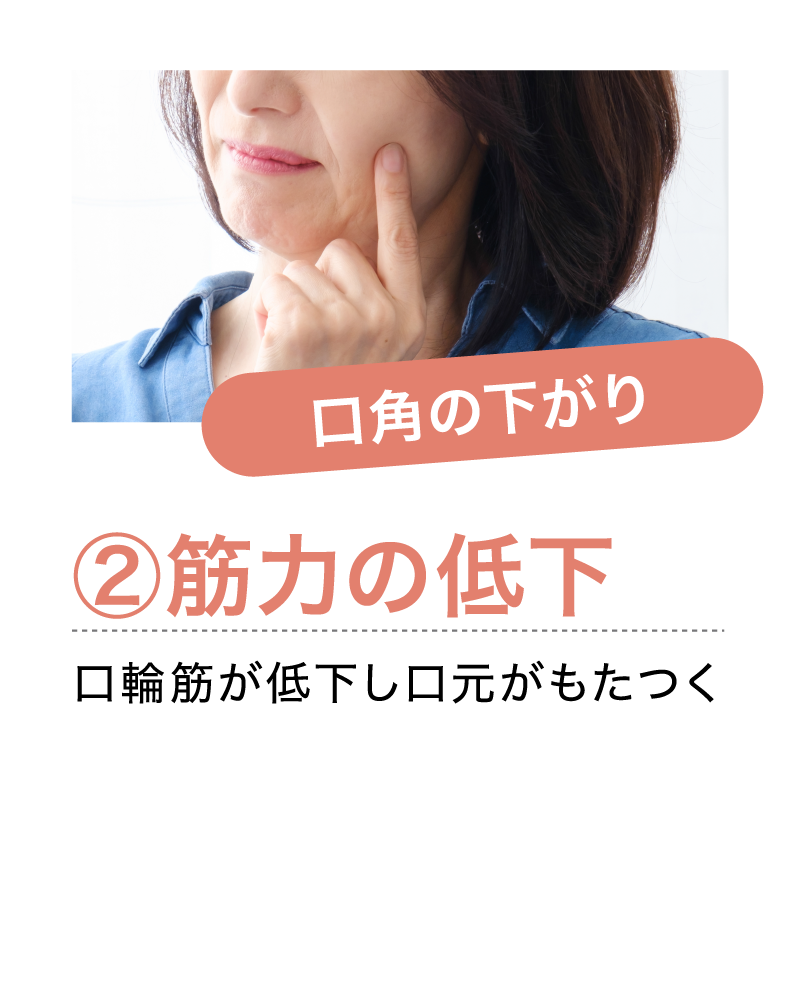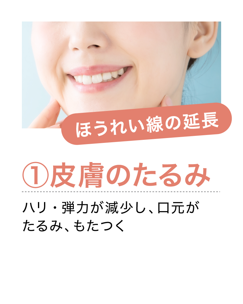 口元は笑顔の印象を大きく左右する部分であるため、たるみが進行すると、表情が老けて見えたり、疲れた印象を与えることがあります。