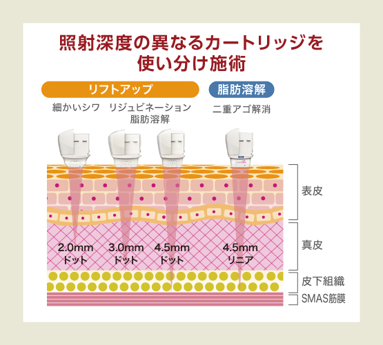 ウルトラセルQ+は、皮膚や脂肪の厚さを見ながら2.0㎜~4.5㎜の照射深度の異なるカートリッジを使い分け、一人ひとりの顔に最適な組み合わせで顔をデザインするように照射します。