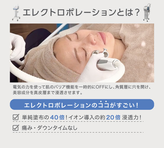 皮膚に短い電気パルスを流すことにより、数秒から数分間角質細胞膜に「穴」を開けた状態にして、美容成分を肌の真皮層まで導入できる施術です。