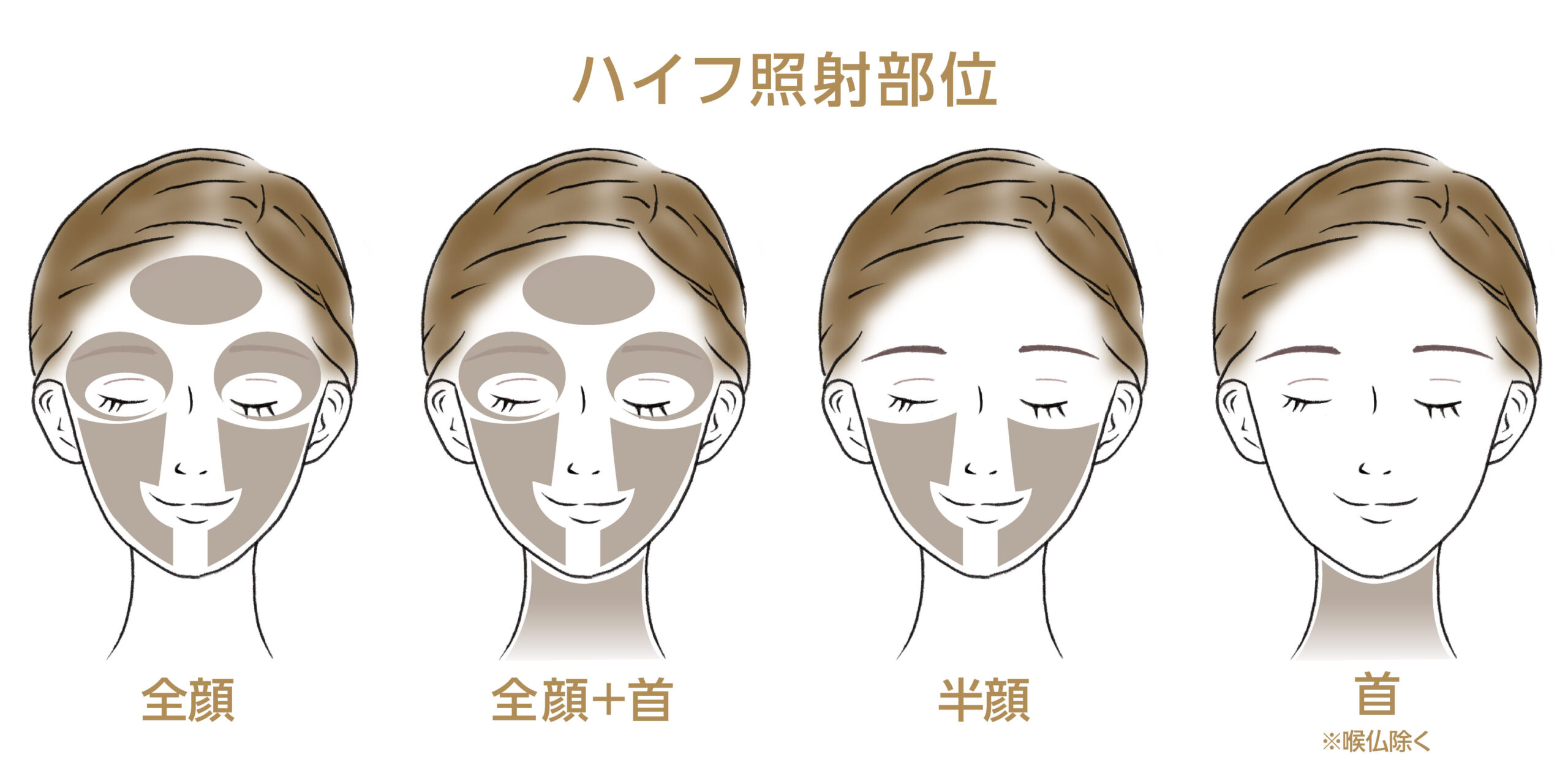 - お悩みの部位によって、引き締めの効果、パーツの引き上げの効果、脂肪層のアポトーシス(小顔効果)など、細く目的を調整することが可能。
